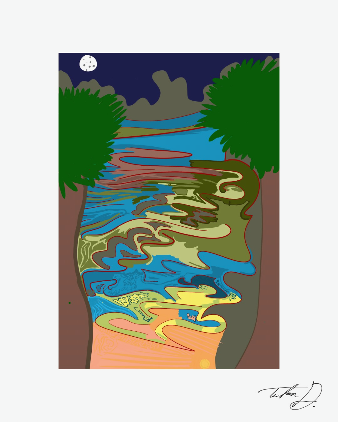 An abstract piece blending fluid lines, vibrant colors, and natural elements. The art transitions from night to day, symbolizing cycles of life, introspection, and growth. The interplay between solid, structured trees and dynamic, flowing water creates a balance of stability and motion, inviting the viewer to find serenity in change.
